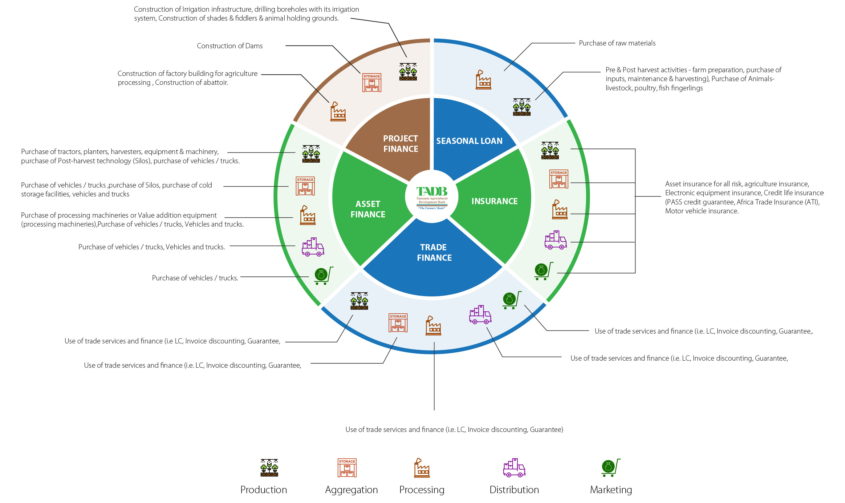 Our financing approach is categorized into (i) Direct Lending - and (ii) Indirect lending approach, which enables customers to use TADB's innovative financial products delivered through partner financial institutions. These services includes the Smallholder Farmers Credit Guarantee Scheme (SCGS), wholesale lending finance and co-financing product.